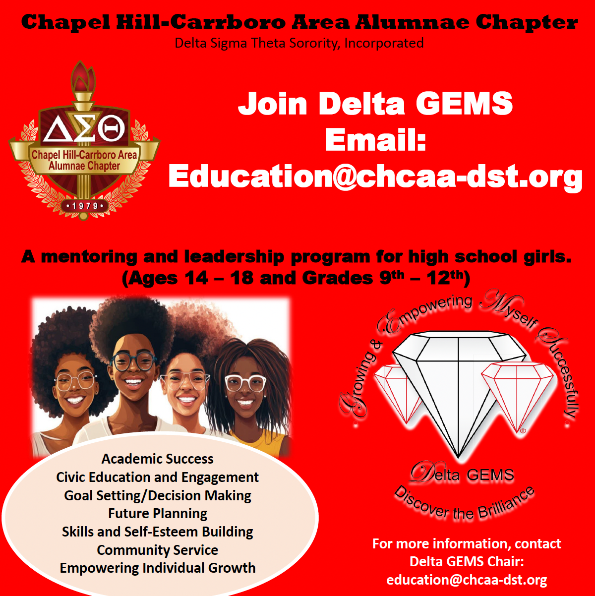 Flyer for the Chapel Hill-Carrboro Area Alumnae Chapter of Delta Sigma Theta Sorority promoting Delta GEMS, a mentoring and leadership program for high school girls ages 14–18. The flyer includes illustrations of smiling teen girls, a diamond logo with “Growing & Empowering Myself Successfully,” program benefits such as academic success and self-esteem building, and contact information for Education@chcaa-dst.org